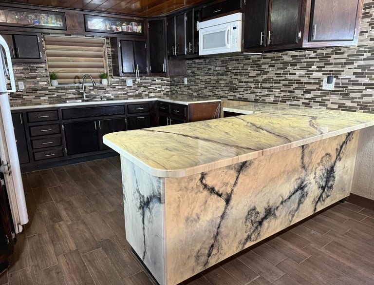 Application of epoxy resin on kitchen countertops, providing a waterproof, heat-resistant, and easy-to-clean surface with modern, customized finishes.